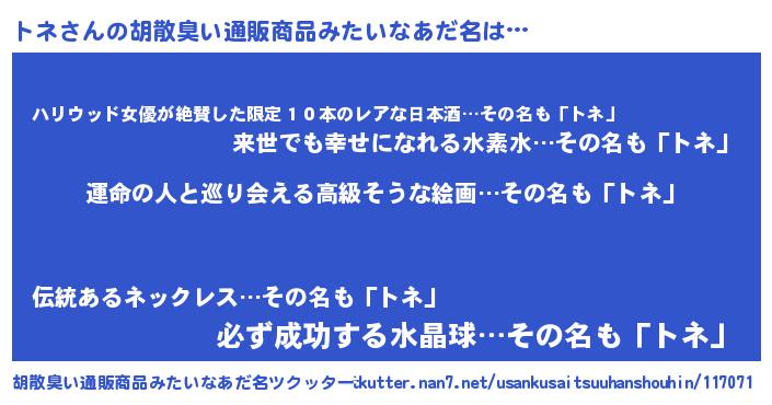 | ポケモン風あだ名 | 『トネダネ』『トーネイ』『ゼニトネ』 |