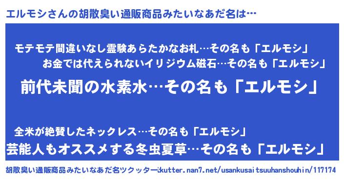| 男性向けラノベタイトル風あだ名 | 『エルモシ~年齢イコール彼女いない歴の魔法使い~』 |
