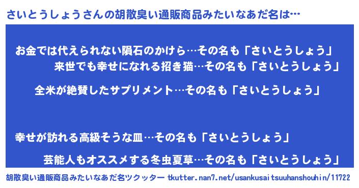 | 意味不明あだ名 | 『とにかく怪しいさいとうしょう』 |