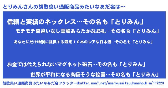 | 男性向けラノベタイトル風あだ名 | 『この素晴らしい世界にとりみんを!』 |
