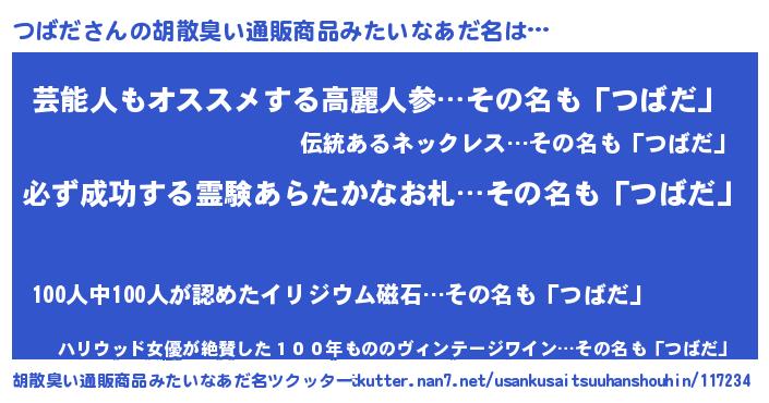 | 男性向けラノベタイトル風あだ名 | 『つばだの憂鬱』『魔弾の王とつばだ』 |