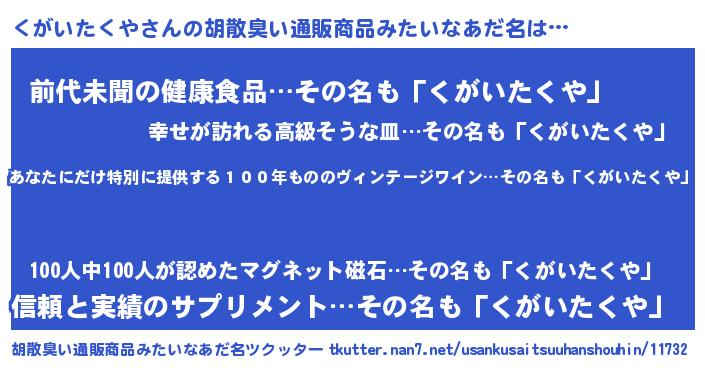| 意味不明あだ名 | 『住所不定無職くがいたくや(8歳)』 |