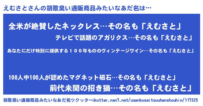| 意味不明あだ名 | 『住所不定無職えむさと(4歳)』 |
