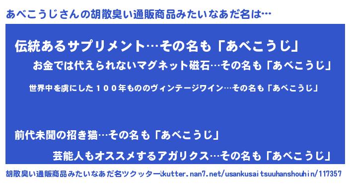 | 意味不明あだ名 | 『住所不定無職あべこうじ(12歳)』 |