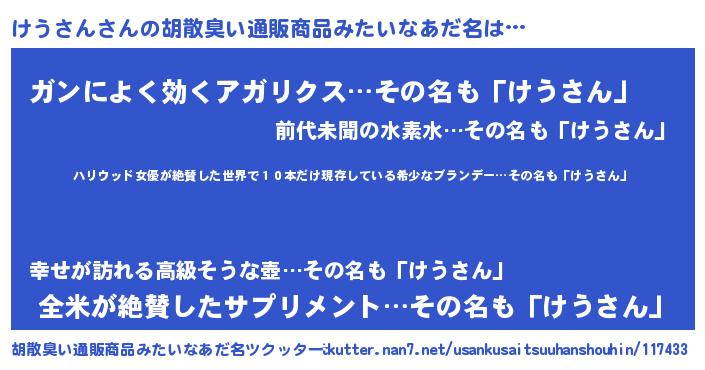 | 意味不明あだ名 | 『住所不定無職けうさん(74歳)』 |