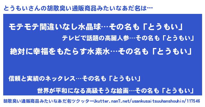 | 男性向けラノベタイトル風あだ名 | 『とうもいという概念が存在しない退屈な世界 』 |