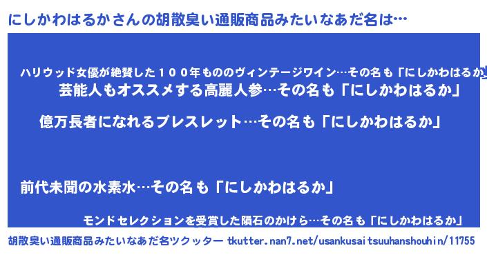 | ヘコむあだ名 | 『にしにー』『にしかわはるか(爆)』 |