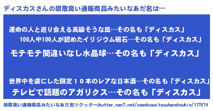 | 男性向けラノベタイトル風あだ名 | 『転生したらディスカスだった件』 |