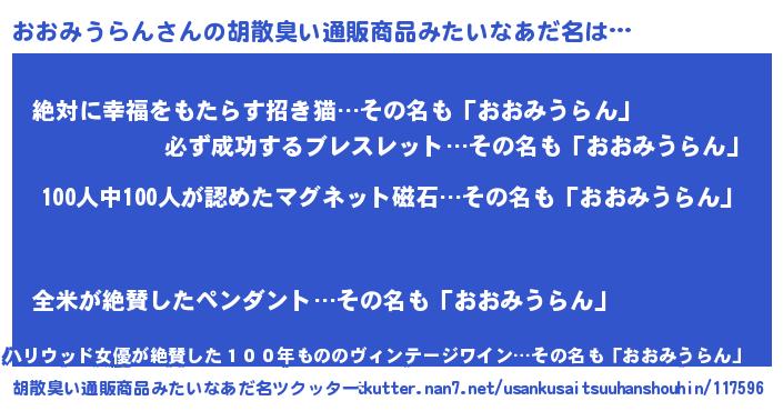 | 男性向けラノベタイトル風あだ名 | 『おまえをオタクにしてやるから、俺をおおみうらんにしてくれ! 』 |