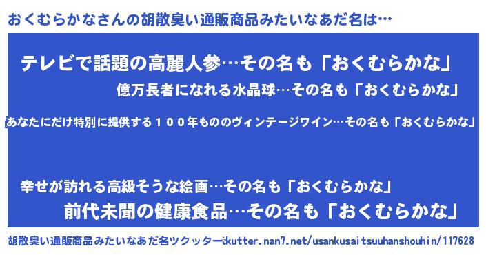 | ヘコむあだ名 | 『おくむらかな(笑)』『おくもー』 |