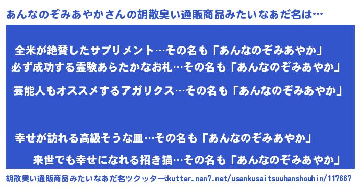 | 意味不明あだ名 | 『ヨモギ科あんなのぞみあやか属』 |