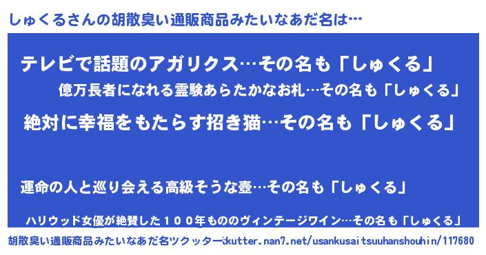 | ヘコむあだ名 | 『しゅくる(笑)』『しゅにゅー』 |
