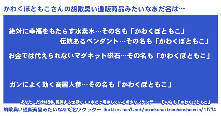 | ヘコむあだ名 | 『かわくぼともこ(小並感)』『かわぷりん』 |