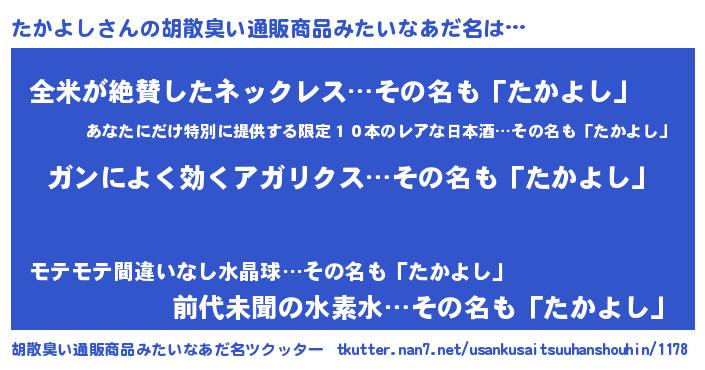 | ヘコむあだ名 | 『たかっぺ』『たかよし(爆)』『豆乳』 |