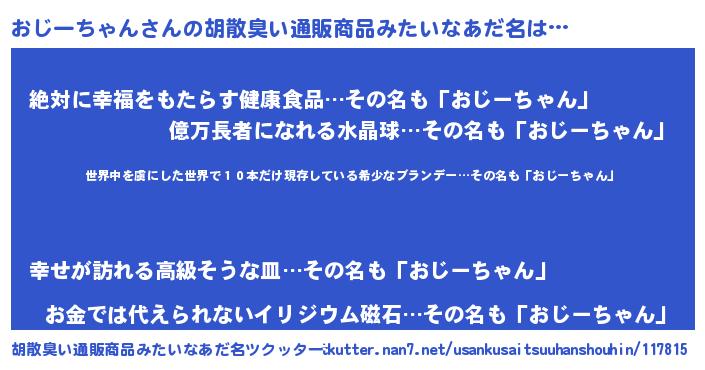 | 男性向けラノベタイトル風あだ名 | 『転生したらおじーちゃんだった件』 |