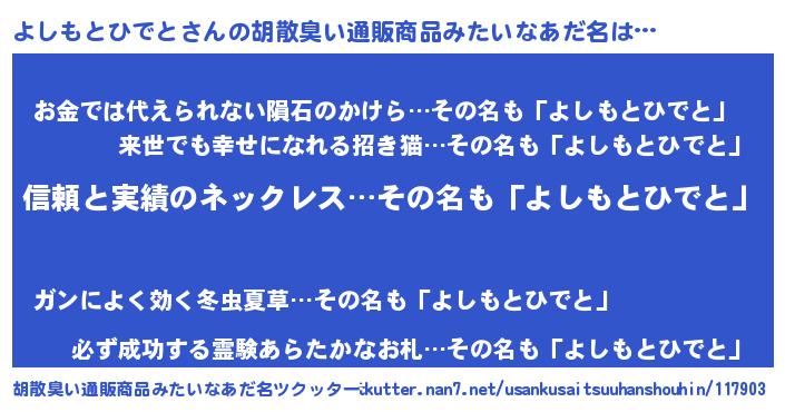 | 男性向けラノベタイトル風あだ名 | 『緋弾のヨシモトヒデト』 |