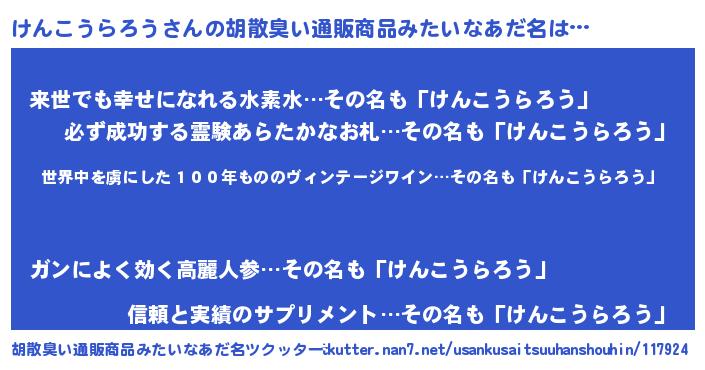 | 男性向けラノベタイトル風あだ名 | 『この素晴らしい世界にけんこうらろうを!』 |