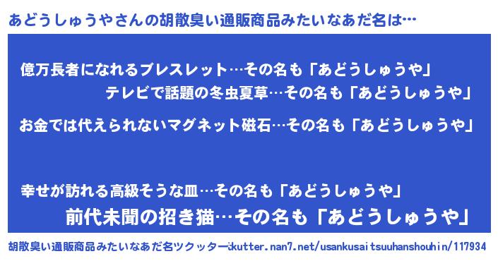 | ヘコむあだ名 | 『あどにー』『あどうしゅうや(遠い目)』 |