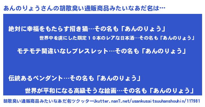| 男性向けラノベタイトル風あだ名 | 『あんのりょうの憂鬱』 |