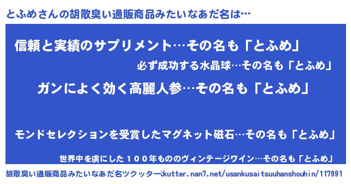 | 男性向けラノベタイトル風あだ名 | 『トフメスレイヤー』『緋弾のトフメ』 |