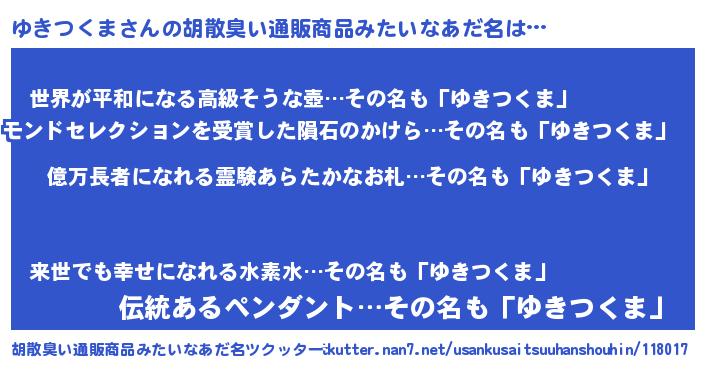 | 男性向けラノベタイトル風あだ名 | 『ユキツクマアートオンライン』 |