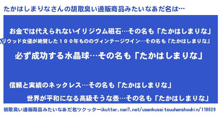 恥ずかしいあだ名 | 『プリティーたかはしまりな』『たかちん』 |