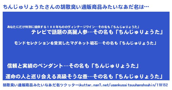 | 男性向けラノベタイトル風あだ名 | 『ノーゲーム・ノーチンジュリョウタ』 |