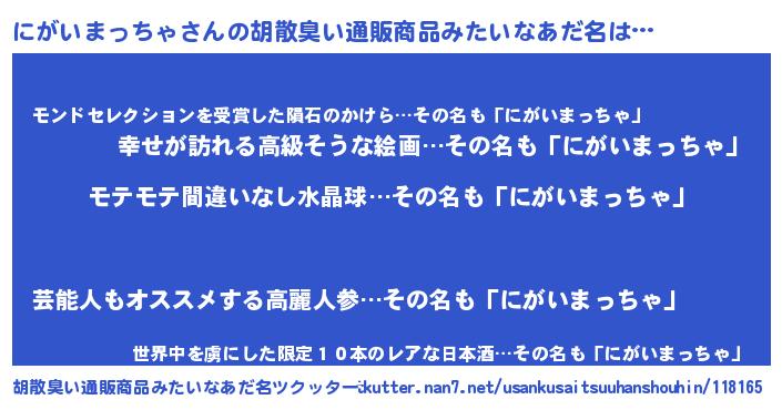| 男性向けラノベタイトル風あだ名 | 『にがいまっちゃの憂鬱』 |