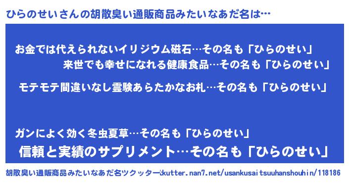 | 男性向けラノベタイトル風あだ名 | 『ひらのせいの憂鬱』『緋弾のヒラノセイ』 |