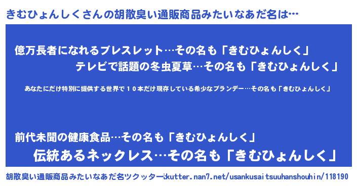| 意味不明あだ名 | 『住所不定無職きむひょんしく(89歳)』 |