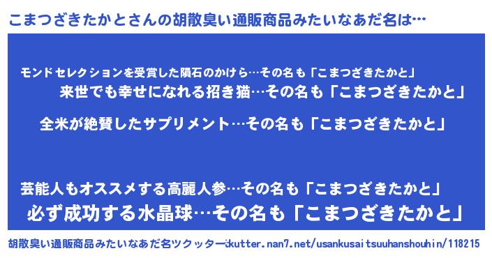 | 男性向けラノベタイトル風あだ名 | 『こまつざきたかと~年齢イコール彼女いない歴の魔法使い~』 |