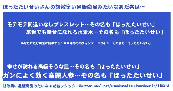 | 男性向けラノベタイトル風あだ名 | 『この素晴らしい世界にほったたいせいを!』 |
