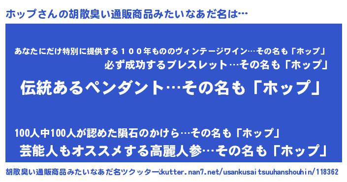 | 男性向けラノベタイトル風あだ名 | 『転生したらホップだった件』 |