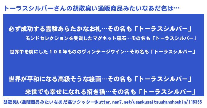 | 男性向けラノベタイトル風あだ名 | 『この素晴らしい世界にトーラスシルバーを!』 |