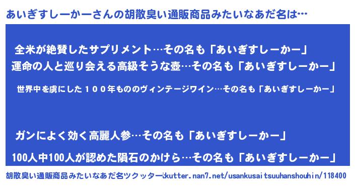 | 意味不明あだ名 | 『住所不定無職あいぎすしーかー(6歳)』 |