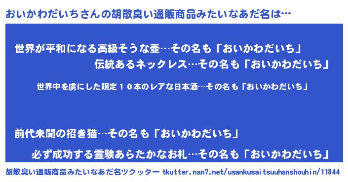 | 男性向けラノベタイトル風あだ名 | 『おいかわだいちに滅ぼされるだけの簡単なお仕事です』 |