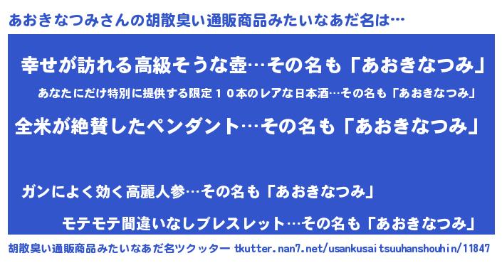 あおきなつみさんの胡散臭い通販商品みたいなあだ名をツクッター!