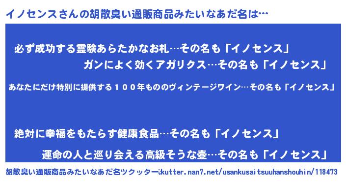 | 男性向けラノベタイトル風あだ名 | 『この素晴らしい世界にイノセンスを!』 |