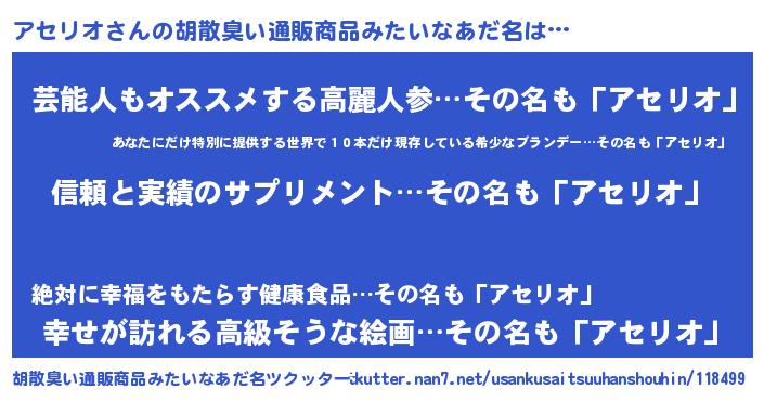 | 意味不明あだ名 | 『とにかく怪しいアセリオ』 |