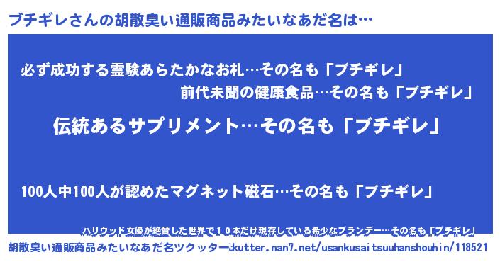 | ヒーロー風カッコイイあだ名 | 『銀牙騎士ブチ』『スーパーブチギレ』 |