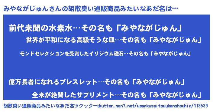 | ヘコむあだ名 | 『みやながじゅん(爆)』『みや太郎』 |