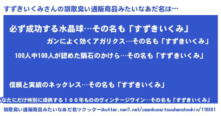 | 男性向けラノベタイトル風あだ名 | 『おまえをオタクにしてやるから、俺をすずきいくみにしてくれ! 』 |