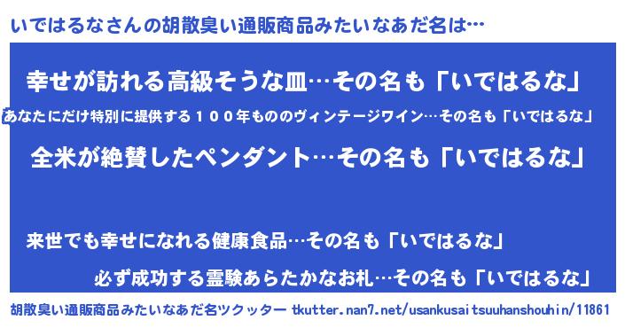 | 男性向けラノベタイトル風あだ名 | 『いではるなの嫁は女の子じゃないと思った?』 |
