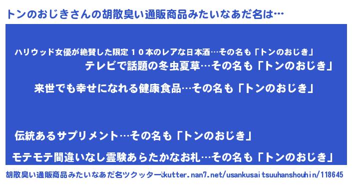 | 男性向けラノベタイトル風あだ名 | 『トンのおじきという概念が存在しない退屈な世界 』 |