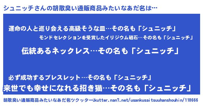 | 意味不明あだ名 | 『とにかく怪しいシュニッチ』 |