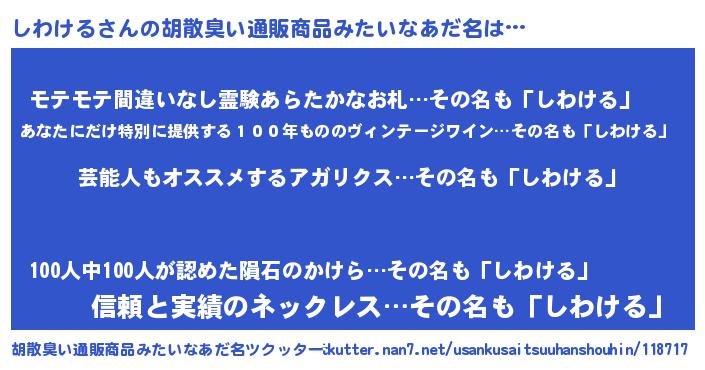 | 男性向けラノベタイトル風あだ名 | 『Re:しわけるから始める異世界生活』 |