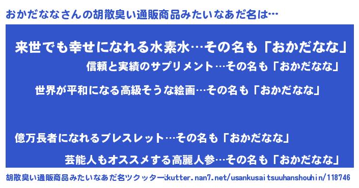 | ヘコむあだ名 | 『なまこ酢』『おかだなな(爆)』 |