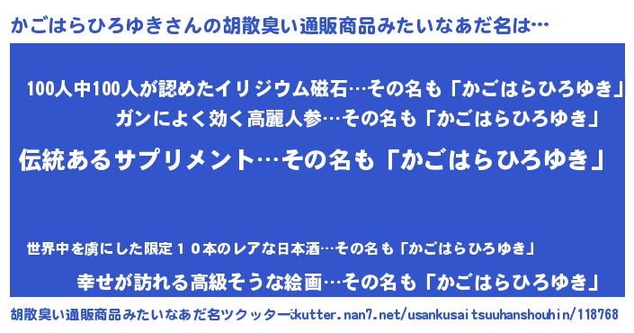 | 男性向けラノベタイトル風あだ名 | 『転生したらかごはらひろゆきだった件』 |