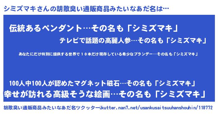 | 意味不明あだ名 | 『住所不定無職シミズマキ(84歳)』 |