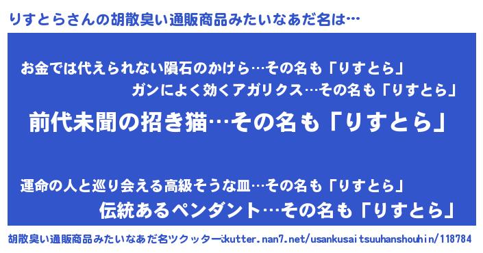 | ヘコむあだ名 | 『りすとら(笑)』『りすぷりん』 |